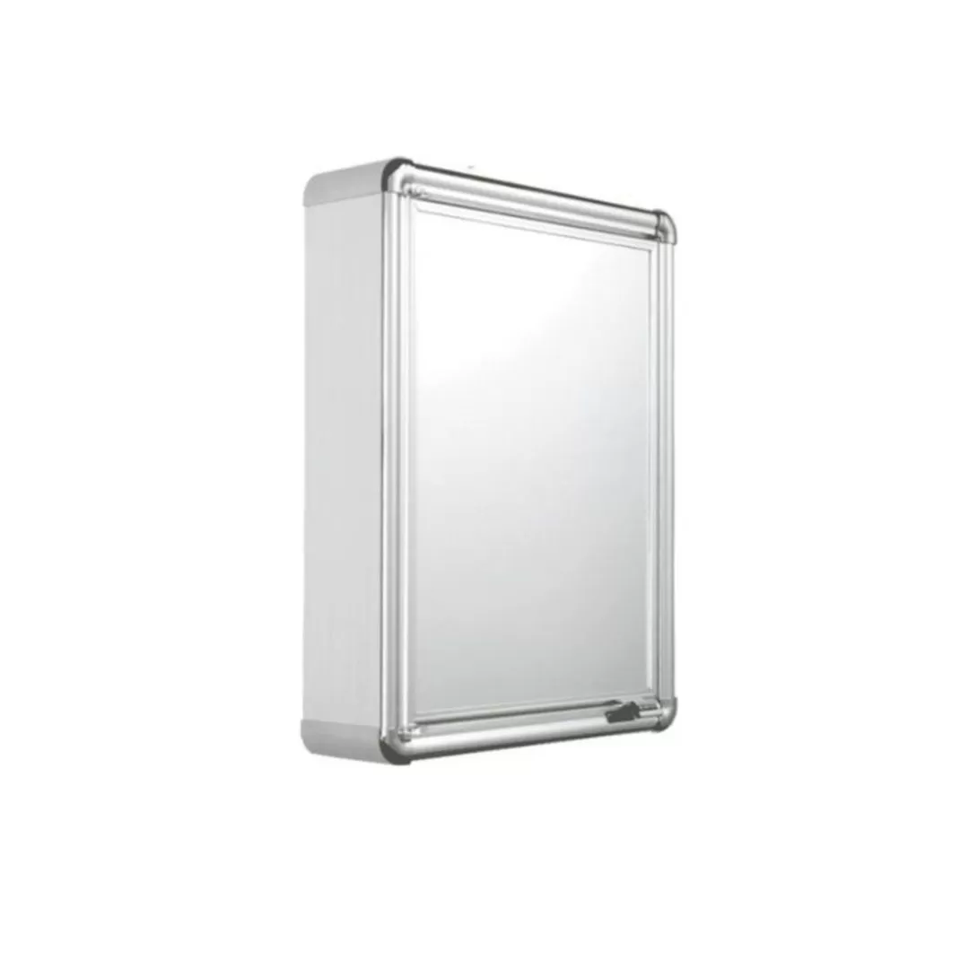 Possui cantoneiras arredondadas na porta e na lateral do armário, para um melhor acabamento, evitando os cantos vivos. Espelho em toda a superfície do armário. Divisão interna com porta-escova e prateleiras embutidas para armazenar os objetos do dia a dia. Leve, resistente e de fácil limpeza. Pode ser instalado sobreposto à parede.